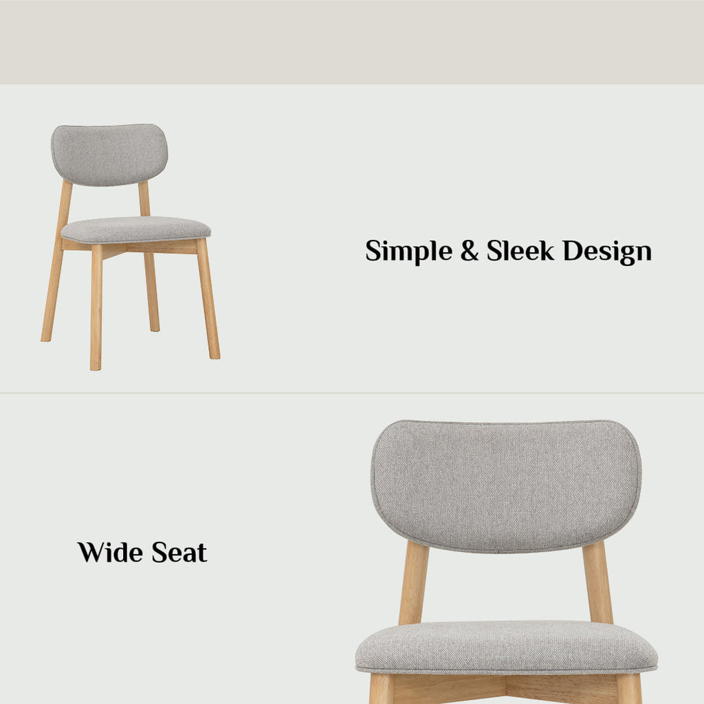 FORMA dining chair in Natural colour frame, Greymist colour Belfast fabric cushion back and seat. The FORMA Dining Chair reflects Mid-Century Modern design with a Modern flair, offering style and comfort in equal measure. Built with Malaysian oak legs in a Natural finish, the chair showcases strength and a warm organic look. Upholstered in Belfast fabric in Greymist, the seat delivers a soft, inviting touch while maintaining durability. With its clean silhouette and compact form, the FORMA Dining Chair is an excellent fit for both residential dining rooms and commercial spaces, delivering timeless appeal and everyday practicality.