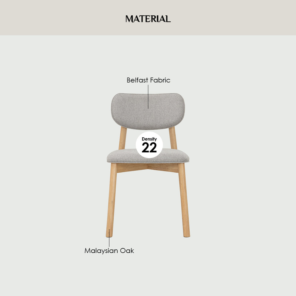 FORMA dining chair in Cocoa colour frame, Anthracite Belfast fabric cushion back and seat. The FORMA Dining Chair reflects Mid-Century Modern design with a Modern flair, offering style and comfort in equal measure. Built with Malaysian oak legs in a Cocoa colour finish, the chair showcases strength and a warm organic look. Upholstered in Belfast fabric in Anthracite Grey the seat delivers a soft, inviting touch while maintaining durability. With its clean silhouette and compact form, the FORMA Dining Chair is an excellent fit for both residential dining rooms and commercial spaces, delivering timeless appeal and everyday practicality.