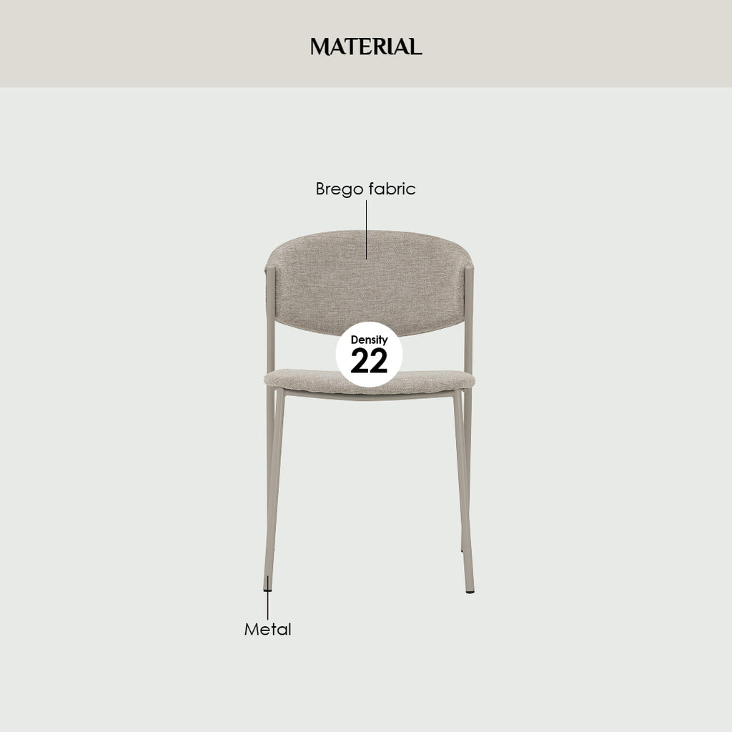 GARIS dining chair in Matt Beige Epoxy colour leg, Beige colour Brego fabric. The GARIS Dining Chair merges Mid-Century Modern charm with Modern versatility, designed to elevate both residential and commercial interiors. Supported by metal legs in a matte beige finish, the chair delivers strength while maintaining a clean, contemporary aesthetic. The Brego fabric seat in Beige provides soft comfort and a neutral tone that pairs effortlessly with various dining settings. Compact yet supportive, the Kory Dining Chair is ideal for modern dining spaces, offering timeless appeal and reliable function.